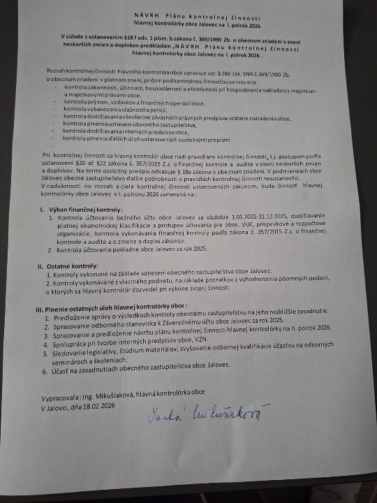 Návrh plánu kontrolnej činnosti hlavnej kontrolórky na I. polrok 2026 24.2.2026 Otvoriť document Návrh plánu kontrolnej činnosti hlavnej kontrolórky na I. polrok 2026 v novom okne. Prílohy Stiahnuť súbor -6415503705062155600 Veľkosť a typ súboru 162 KB / JPG